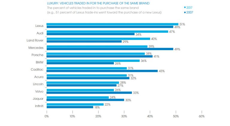 ทางด้านแบรนด์หรู Lexus เป็นแบรนดฺที่มีผู้ภักดีมากที่สุด โดยมียอดแลกรถใหม่สุงถึงร้อยละ 51 ในปี 2017 ที่ผ่านมา ตามมาด้วย Audi ที่มียอดแลกรถใหม่ร้อยละ 47 จากเดิมในปี 2007 มียอดเพียงร้อยละ 34