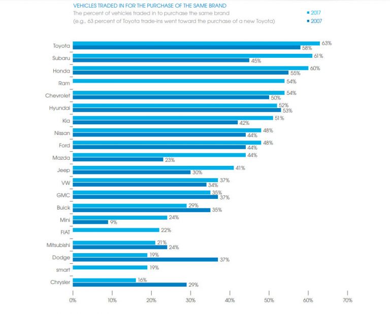 จากการสำรวจแบรนด์ตลาดทั่วไป พบว่า Toyota ยังคงครองแชมป์ในเรื่องการเป็นแบรนด์รถยนต์ที่คนภักดีที่สุดในตลาด ตั้งแต่อดีตตจนถึงปัจจุบัน โดยในปี 2007 มีคนเข้ามา Trade in รถ สูงถึง 58% และ10ปีให้หลัง ปี 2017 ทาง Toyota มีผู้เข้ามาซื้อรถใหม่โดยแลกรถเก่าสูงถึงร้อยละ 63