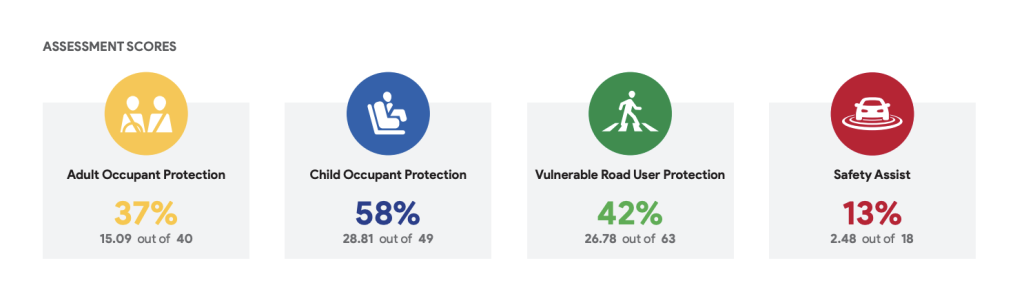 จะเห็นได้ว่า รถมีคะแนน ความปลอดภัย ในระดับหนึ่ง แต่มากเท่าไร โดยเฉพาะอย่างยิ่ง คะแนน ในส่วนของ Safety Assist อยู่ในระดับต่ำมาก เนื่องจากมีเพียงบางระบบ และไม่ได้ มีระบบตัวช่วยขั้นสูงให้มา