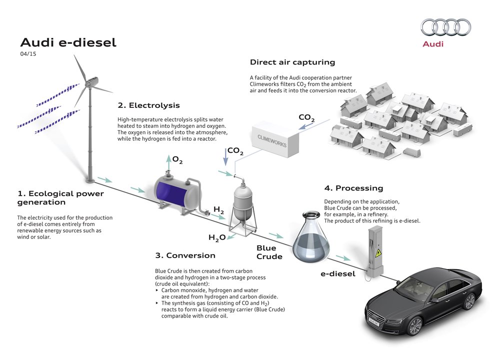 แนวทางของอาวดี้ใหม่ ในการสร้างน้ำมันเชื้อเพลิงสังเคราะห์ที่ไม่เพียงแต่ไม่ต้องใช้พื้นฐานจากน้ำมันดิบเท่านั้น หากยังสามารถปรุงแต่งให้เกิดการเผาไมห้ได้หมดจดสะอาด แถมยังสามารถทำได้ทั้งน้ำมันเบนซิน หรือที่เรียกว่า e-Gasoline และรวมถึงน้ำมันดีเซลสังเคราะห์ หรือ e-diesel ด้วย