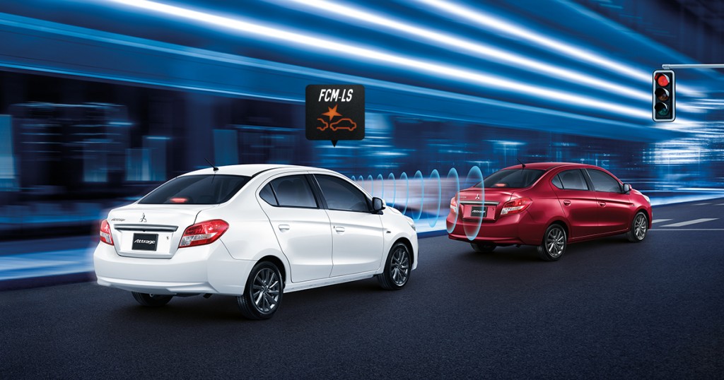 เริ่มต้นกับรถสองคันแรกจากค่ายทรีไดมอนด์ อย่าง Mitsubishi Mirage กับ Attrage สองอีโคคาร์ในตลาดที่มาพร้อมระบบเบรกฉุกเฉินอัตโนมัติที่ความเร็วต่ำ หรือในชื่อเฉพาะว่า FCM-LS ซึ่งติดตั้งมาบนรถรุ่น GLS และ GLS-LTD อันมีราคาเริ่มต้นสบายกระเป๋าที่สุดบน Mirage ในราคาเพียง 567,000 บาท