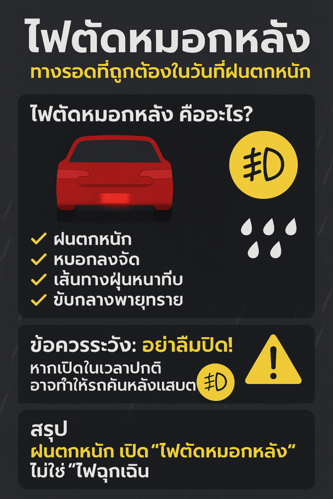 จำไว้แค่นี้ครับ — ฝนตกหนัก เปิด “ไฟตัดหมอกหลัง” ไม่ใช่ “ไฟฉุกเฉิน” (ถ้ารถคุณมีให้ใช้) แล้วอย่าลืมปิดหลังใช้เสร็จครับ