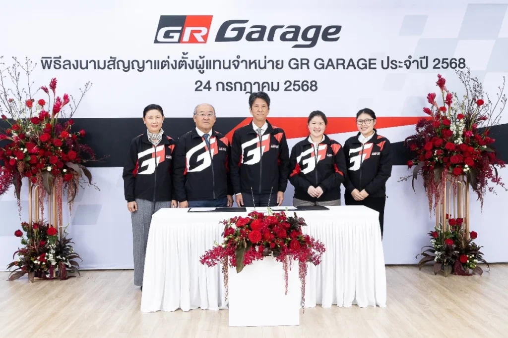นาย โนริอากิ ยามาชิตะ กรรมการผู้จัดการใหญ่ บริษัท โตโยต้า มอเตอร์ ประเทศไทย จำกัด พร้อมด้วยตัวแทนจากผู้แทนจำหน่ายโตโยต้า ประกอบด้วย คุณพิเทพ จันทรเสรีกุล บริษัท โตโยต้า กรุงไทย จำกัด คุณจิรเดช สมภพรุ่งโรจน์ บริษัท โตโยต้า เค.มอเตอร์ส ผู้จำหน่ายโตโยต้า จำกัด คุณสุชาวดี ประโยชน์อมร ภาณุประภา พร้อมด้วย คุณคาร์ล ออพเพนบอร์น บริษัท โตโยต้า ธนบุรี จำกัด คุณเรืองชัย จิตรสกุล บริษัท โตโยต้าริช จำกัด คุณกมลพงศ์ สงวนตระกูล บริษัท โตโยต้าขอนแก่น ผู้จำหน่ายโตโยต้า จำกัด และ คุณชัยภัทร ณ ระนอง บริษัท โตโยต้าเพิร์ล ผู้จำหน่ายโตโยต้า จำกัด ร่วมเป็นเกียรติในพิธีลงนามสัญญาแต่งตั้งผู้แทนจำหน่าย GR GARAGE ประจำปี 2568 เมื่อวันที่ 24 กรกฎาคม 2568 ณ TOYOTA ALIVE ถนนบางนา-ตราด กม.3