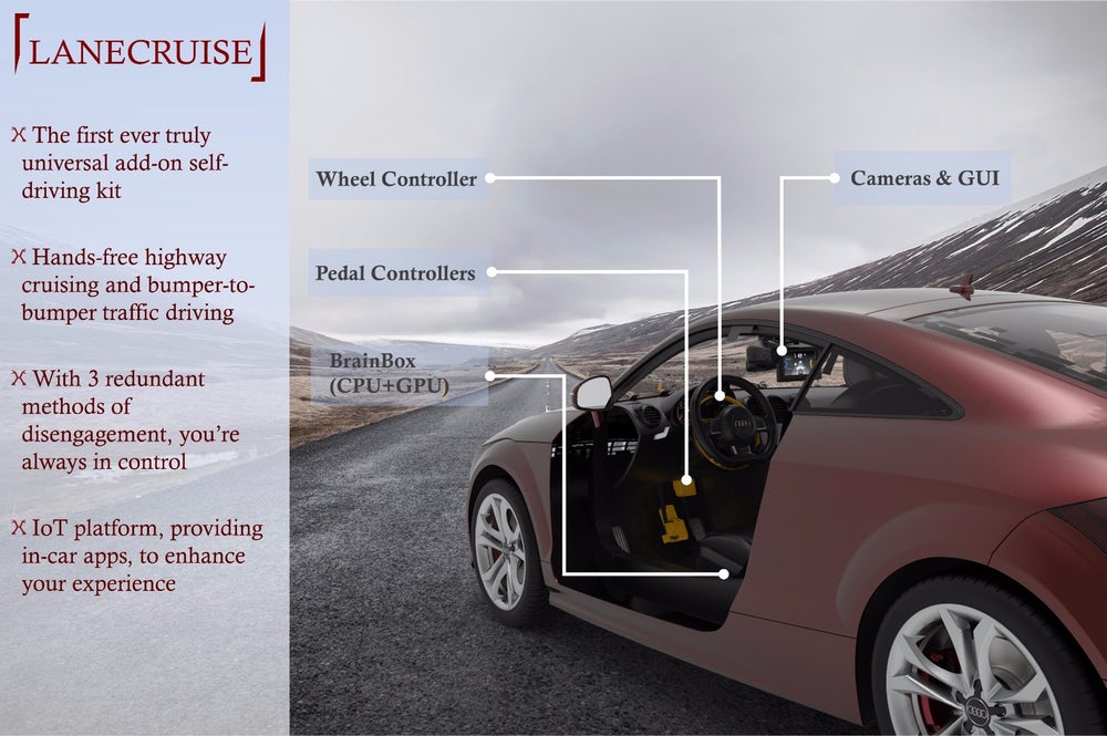 ตัวรถบบนี้ ถูกเรียกว่า   Land Cruise   มันประกอบด้วยชุดกล่องควบคุมต่างๆ รวมถึงกล้อ งและ อุปกรณ์หน้าจอ ส่วนติดต่อผู้ใช้งาน ซึ่งเมื่อติดตั้งเสร็จ ระบบจะทำงานได้หลากรูปแบบ อาทิ ป้องกันการชนทางด้านหน้า  ควบคุมความเร็วและพวงมาลัยของรถ มันช่วยให้รถคันเก่าที่เราใช้ง่ายมากขึ้นในการขับขี่