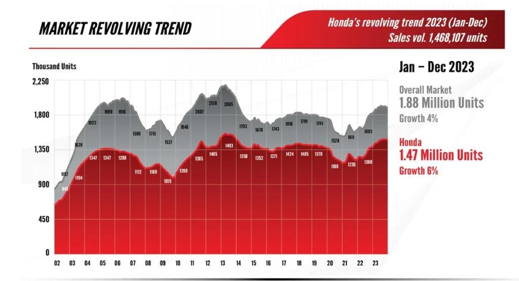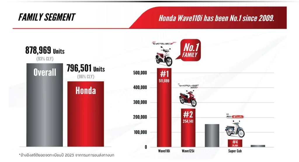 ไทยฮอนด้า เผยยอดจำหน่ายรถจักรยานยนต์ฮอนด้าปี 2023 ภาพรวมตลาดแตะระดับ 1.88 ล้านคัน ฮอนด้าคว้ายอดจดทะเบียนสูงสุดที่ 1.47 ล้านคัน ครองอันดับที่ 1 ติดต่อกันเป็นปีที่ 35 พร้อมคว้ายอดจดทะเบียนสูงสุด 5 อันดับแรก