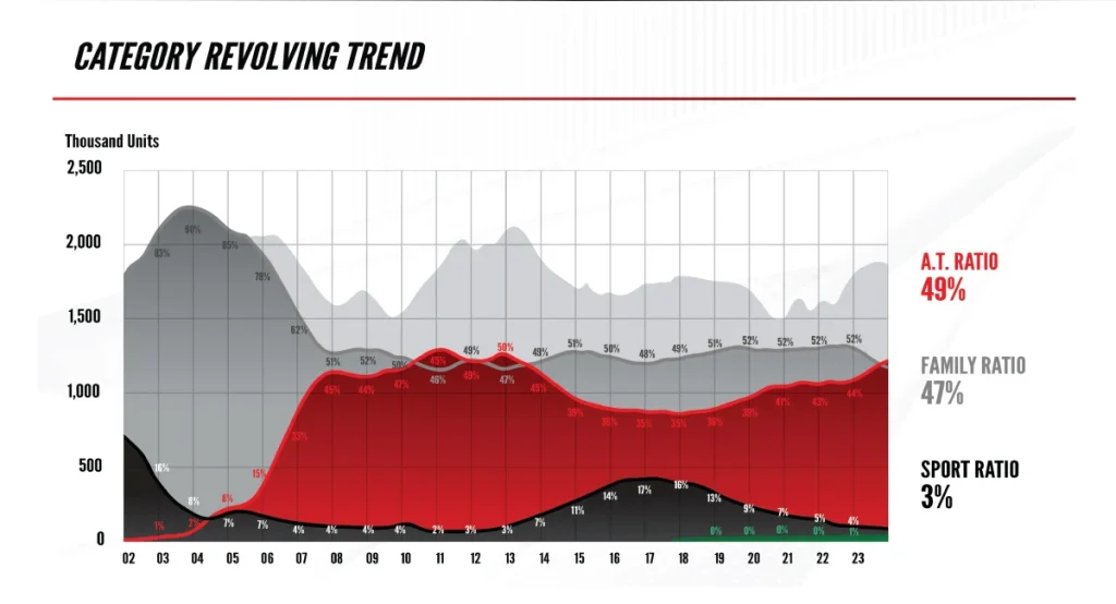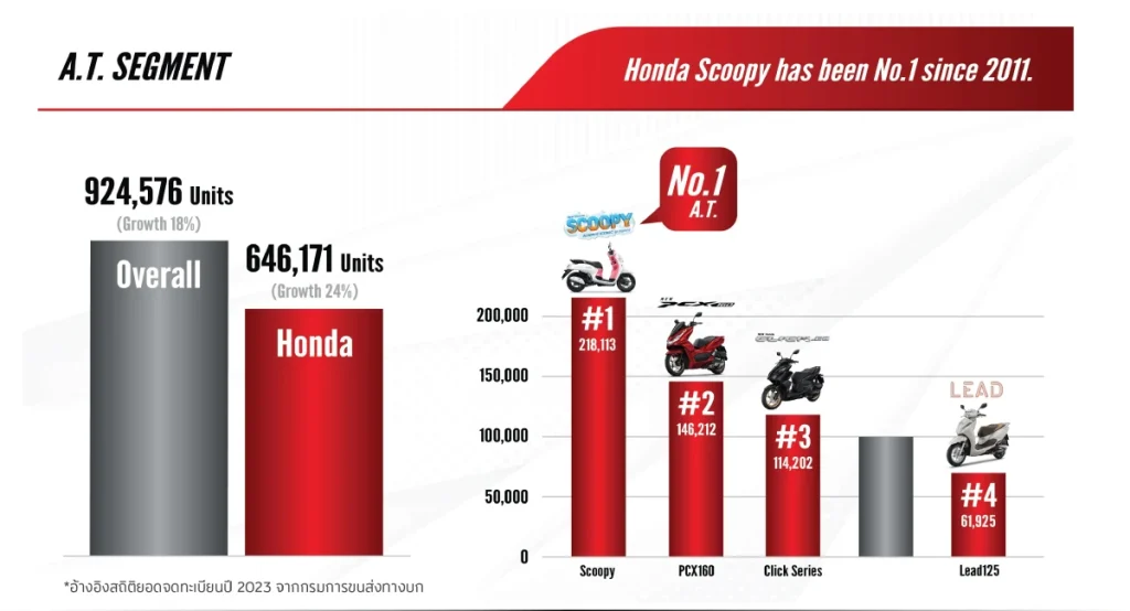 มร.ชิเกโตะ คิมูระ ประธานกรรมการบริหาร บริษัท ไทยฮอนด้า จำกัด กล่าวว่า “ภาพรวมตลาดรถจักรยานยนต์ไทยปี 2023 มีแนวโน้มที่ดี โดยตลาดรวมมียอดจดทะเบียนอยู่ที่ 1.88 ล้านคัน เติบโตขึ้นจากปีที่ผ่านมา 4% โดยกลุ่มรถเอ.ที. ได้รับความนิยมสูงที่สุดมีส่วนแบ่งการตลาดอยู่ที่ 49% เพิ่มขึ้นจากปีที่แล้ว 5% ถือเป็นกลุ่มที่มีแนวโน้มเติบโตขึ้นเรื่อยๆ เนื่องจากพฤติกรรมของผู้บริโภคที่เปลี่ยนแปลงไปจากการใช้งานที่สะดวกสบาย และมีสไตล์ให้เลือกอย่างหลากหลาย ในขณะที่อันดับรองลงมาเป็นรถครอบครัว โดยมีสัดส่วนอยู่ที่ 47% และกลุ่มรถสปอร์ตมีสัดส่วนอยู่ที่ 3%”