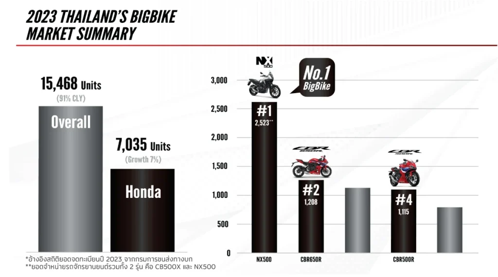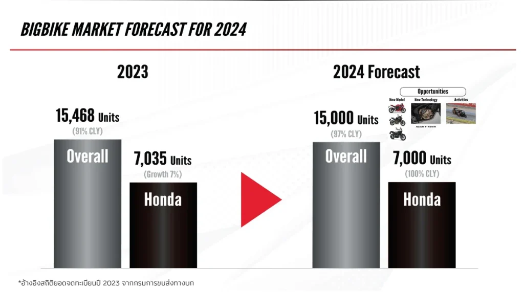 ในส่วนของตลาดรถบิ๊กไบค์ หรือรถจักรยานยนต์ขนาด 400cc ขึ้นไป ตลอดปี 2023 มียอดจดทะเบียนอยู่ที่ 15,468 คัน ลดลง 9% เมื่อเทียบกับปีก่อนหน้า ในขณะที่ฮอนด้ามีตัวเลขอยู่ที่ 7,035 คัน เติบโตขึ้น 7% มากกว่าตลาดรวม และในปี 2024 นี้ คาดว่าตลาดรวมจะอยู่ที่ระดับ 15,000 คัน ในขณะที่ฮอนด้าตั้งเป้ายอดจำหน่ายไว้ที่ 7,000 คัน โดยปัจจัยบวกที่ทำให้ฮอนด้าเติบโตประกอบไปด้วยการเปิดตัวเทคโนโลยีใหม่อย่าง Honda E-Clutch ในรถตระกูล 650Series และการจัดกิจกรรมอย่างต่อเนื่องให้กับผู้ใช้”