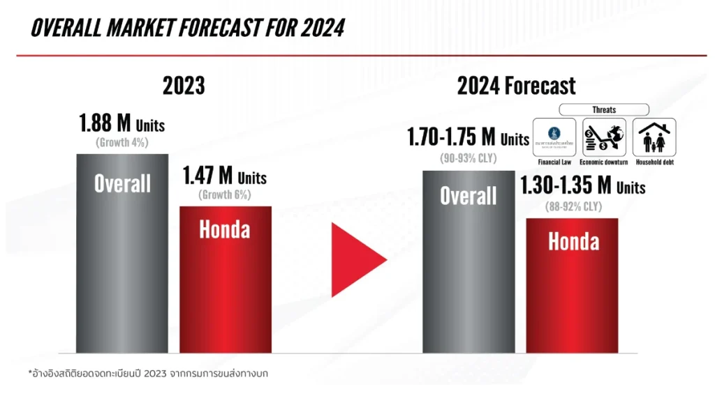มร.ชิเกโตะ คิมูระ กล่าวต่อว่า “สำหรับในปี 2024 ด้วยปัจจัยของสภาวะเศรษฐกิจของโลกที่ไม่แน่นอน การเปลี่ยนแปลงในเรื่องกฎหมายด้านการเงิน ปัญหาหนี้สินครัวเรือนที่อยู่ในระดับสูง อาจทำให้ลูกค้าชะลอการซื้อสินค้า และส่งผลให้ความต้องการในตลาดลดลง จึงคาดการณ์ว่าตลาดรถจักรยานยนต์ไทยจะมียอดจดทะเบียนอยู่ที่ประมาณ 1.70 – 1.75 ล้านคัน โดยฮอนด้าวางเป้าจำหน่ายไว้ที่ 1.30 -1.35 ล้านคัน