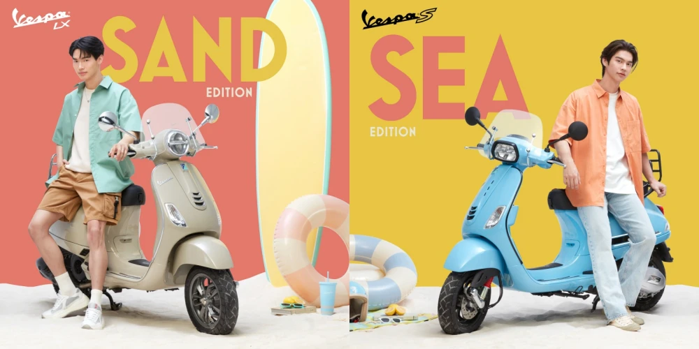 กับ เวสป้า แซนด์ แอนด์ ซี (VESPA SAND & SEA) ที่นำแรงบันดาลใจของไลฟ์สไตล์การพักร้อนแบบชาวอิตาลีผสานเข้ากับสีสันที่โดดเด่น และมีเอกลักษณ์ของเมืองชายฝั่งทะเลในประเทศอิตาลี หรือ Italy Coastline ดีไซน์สู่พรีเมียมสกู๊ตเตอร์ ที่นำเสนอผ่าน ‘เวสปิสตี้’ (Vespisti) หรือ Friend of Vespa ประจำประเทศไทย อย่าง ไบร์ท-วชิรวิชญ์ ชีวอารี กับ VESPA LX 125 I-GET SAND EDITION และ วิน-เมธวิน โอภาสเอี่ยมขจร กับ VESPA S 125 I-GET SEA EDITION