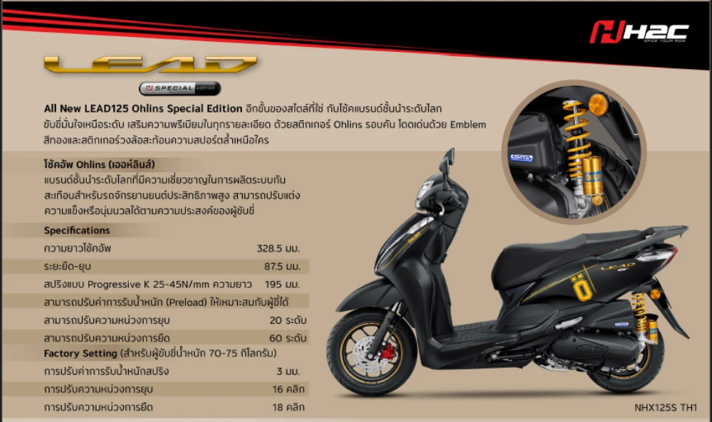 พิเศษไปอีกขั้นกับ All New LEAD125 Öhlins Special Edition ยกระดับความเท่ด้วยโช้คอัพที่มาพร้อมกับเทคโนโลยี STX 46 สุดล้ำจาก Öhlins โช้คแบรนด์ชั้นนำระดับโลก ขับขี่มั่นใจเหนือระดับ