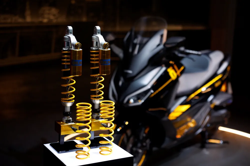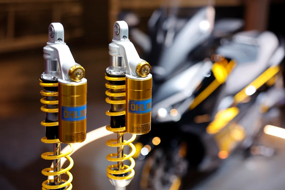 นอกนั้นยังมีการติดตั้งชิ้นส่วนเสริมหล่อ เช่น แผ่นฟลอบอร์ดงานอลูมิเนียม CNC สีเหลืองทอง, พักเท้าคนซ้อนงานอลูมิเนียม CNC สีเหลืองทอง และที่ขาดไม่ได้คือโช้กหลัง Ohlins แบบต้นคู่ มีกระปุกซับแทงค์แก๊สแยก พร้อมฟังก์ชั่นในการปรับเซ็ทค่าต่างๆได้ 3 จุด ทั้ง พรีโหลด คอมเพรสชัน และ รีบาวน์ เพื่อการรีดเค้นประสิทธิภาพในการใช้งานให้ตอบโจทย์กับการใช้งานของผู้ขี่อย่างตรงจุดที่สุด