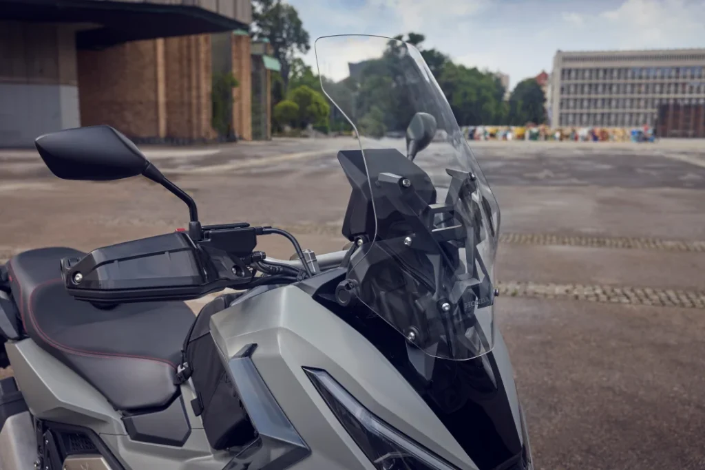 และแม้ชิลด์กันลมด้านหน้าจะมีหน้าตาเหมือนเดิม มีความเอียง 11 องศา และสามารถปรับระยะสูง-ต่ำได้ 139 มิลลิเมตรเท่าเดิม แต่คราวนี้มันมาพร้อมกับตัวปรับที่ผู้ใช้สามารถใช้มือซ้ายข้างเดียวปรับตำแหน่งมันได้ 3 ระดับ จากเดิมที่ต้องใช้สองมือในการปลดล็อคแล้วปรับระดับชิลด์หน้า ซึ่งทำให้เสียเวลาในการเดินทางโดยไม่จำเป็น (แต่เดิมทีชิลด์หน้าของตัวรถโฉมปี 2021-2024 จะสามารถปรับความสูง-ต่ำได้ 5 ระดับ)