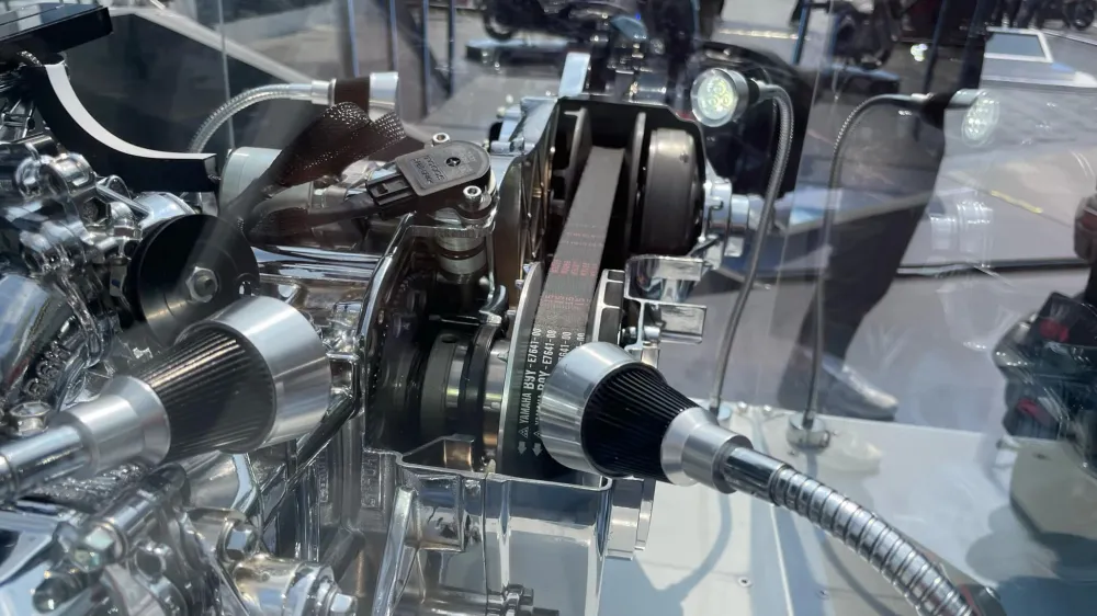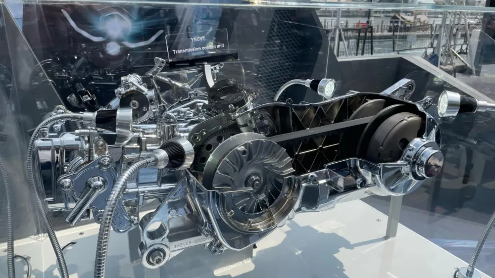 แต่ในคราวนี้ระบบเกียร์ CVT ของมัน หากเป็นตัวรถรุ่น TechMax ก็จะได้รับการปรับเปลี่ยนชิ้นส่วนระบบส่งกำลังใหม่ ให้กลายเป็นระบบเกียร์ YECVT (Yamaha Electric CVT) ซึ่งทำให้คราวนี้ตัวชุดพูลเล่ย์ตัวหน้า ที่จะคอยคุมการเปลี่ยนอัตราทดโดยอาศัยการเคลื่อนที่ของตุ้มแรงเหวี่ยงตามรอบเครื่องยนต์ ก็จะเปลี่ยนไปอาศัยการคุมจังหวะเปลี่ยนอัตราทดโดยตัวผลักจากมอเตอร์ไฟฟ้า ที่ได้รับคำสั่งจากระบบสมองกลอีกทีแทน