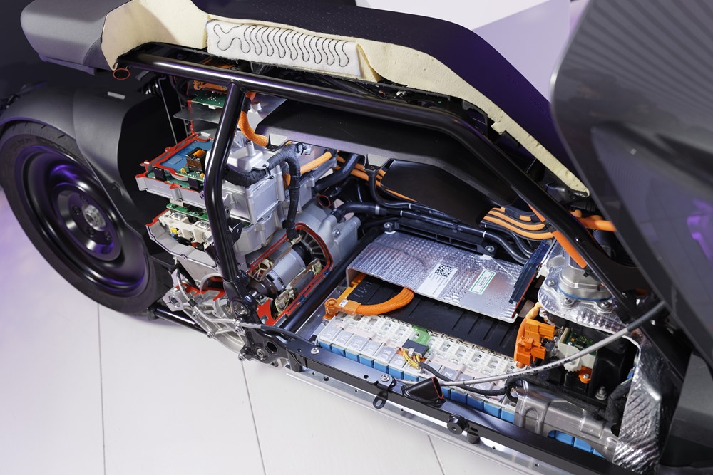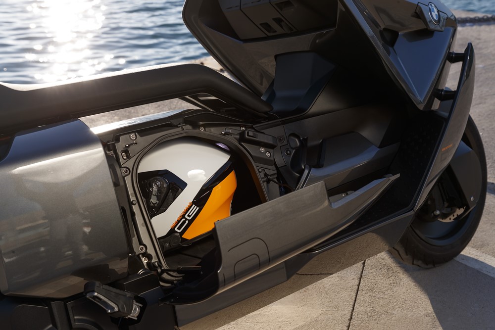 ในส่วนของชุดแฟริ่งตรงกลาง ที่เห็นเป็นพื้นที่สี่เหลี่ยมขนาดใหญ่ แท้จริงแล้วนอกจากมันจะมีช่องเก็บของที่สามารถใส่หมวกกันน็อคเต็มใบได้หนึ่งใบ อีกสิ่งที่ซ่อนอยู่ทางด้านล่างลงไปอีกนิดก็คือ แบตเตอรี่ลิเทียม-ไอออนขนาด 8.9 kWh ซึ่งรองรับระยะทางในการใช้งานสูงสุด 130 กิโลเมตร และผู้ใช้สามารถชาร์จไฟจาก 0-100% ได้ภายในเวลา 4 ชั่วโมง กับอีก 20 นาที ด้วยการชาร์จผ่านแท่นชาร์จไฟติดบ้าน