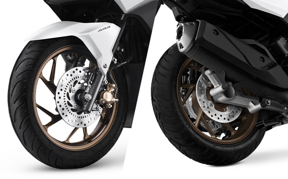 ในส่วนชุดล้อเอง นอกจากการเปลี่ยนลายแบบ 5 ก้านคู่ เป็น 5 ก้านตัว Y แล้ว ชุดล้อเองก็ยังใหญ่ขึ้นด้วย เป็นขนาด 100/80-14 และ 120/70-14 เพื่อเพิ่มพื้นที่ในการยึดเกาะของหน้ายาง และยังทำให้ตัวรถมีความมั่นคงมากกว่าเดิม