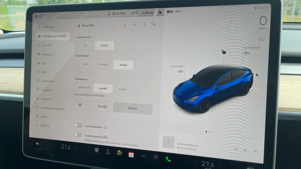 ผ่านชีวิตในเมืองถนนว่างก็ได้เวลา พุ่งลองสมรรถนะดูบ้าง เมื่อปรับเป็นโหมดสปอร์ต ขาคันเร่งสปอร์ต สมรรถนะที่แท้จริงของ Tesla Model Y ก็ผงาดออกมา ขาคันเร่งไว รกดปุ๊ปพร้อมพุ่งประดุจม้าพยศ ต้องระวังมากในการใช้ขาคันเร่งนี้