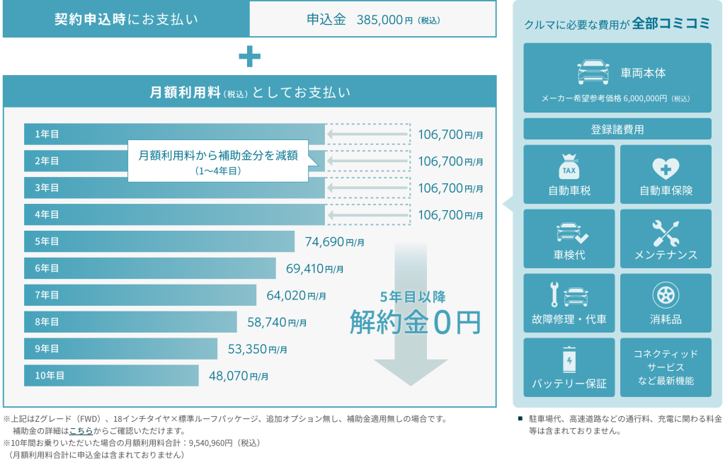 โดยแผนการจ่ายค่าเช่านี้ ในปีที่ 6-10 จะมีการลดค่าเช่า จาก ในปีที่ 1-4 ลงเหลือ 74,690 เยน หรือ 19,000 บาท ต่อเดือน และลดลง เหลือต่ำสุดในปี ที่ 10 ในราคาเดือนละ 48,070 เยน หรือราวๆ 12,000 บาท ต่อเดือน (ในรุ่น Z ขับเคลื่อนล้อหน้า)