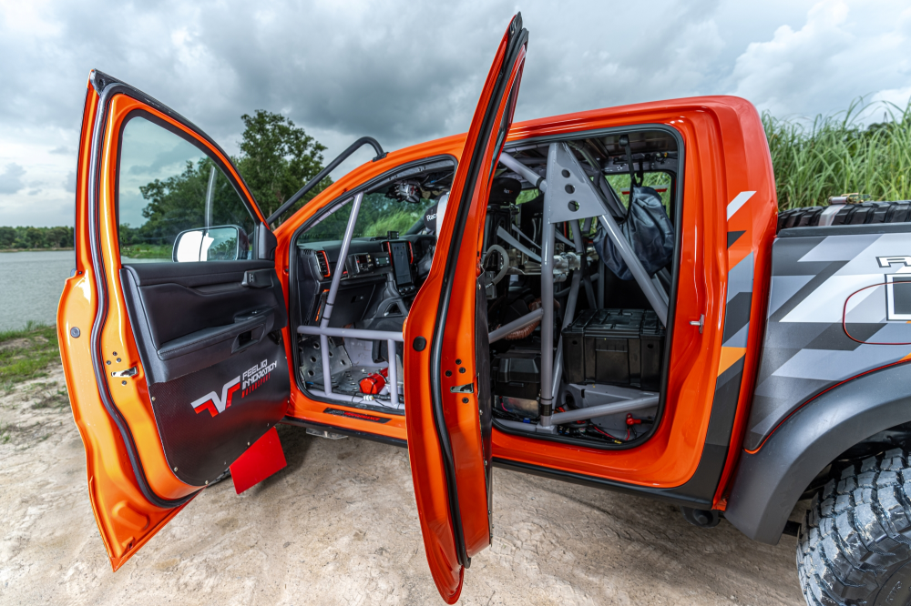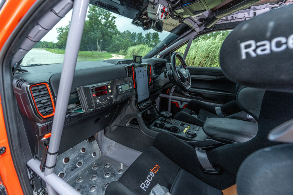 ไปจนถึงการบรรทุกยางรถยนต์สำรอง และกว้านสำหรับฉุดลากไว้ในกระบะท้าย เสริมความดุดันของภายนอกสีส้มโค้ด ออเร้นจ์ ด้วยสติกเกอร์ที่สะท้อนดีเอ็นเอของ Ford Performance นอกจากนี้ ทีมแข่งยังใช้โช้คอัพเดิมของ FOXTM ที่ได้รับการยกระดับให้พร้อมสำหรับการแข่ง