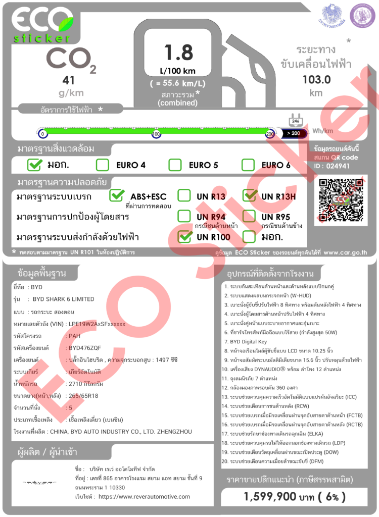 ล่าสุด เว็บ ECO STICKER เพิ่งจะประกาศราคา BYD Shark 6 Limited เพียง 1,599,900 บาท หรือถูกลงกว่าเดิม 100,000 บาท