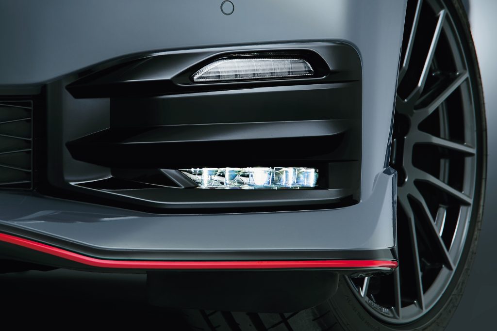 สเกิร์ตหลังเสริมไฟตัดหมอกหลัง LED แนวตั้งกับท่อไอเสียคู่กระจกมองข้างพร้อมไฟเลี้ยวในตัวมีละลายฝ้าในตัวกระจกได้แบบสีดำขลิบแดง สปอยเลอร์หลังดีไซน์พิเศษ ล้ออัลลอยสีดำเข้มขนาด 19 นิ้วจาก Enkei พร้อมยางสปอร์ตแก้มเตี้ยรุ่นพิเศษจาก Dunlop รุ่น SP SPORT MAXX GT600 พร้อมตราสัญลักษณ์ GT สุดคลาสสิกติดตรงแก้มบังโคลนซ้าย-ขวา