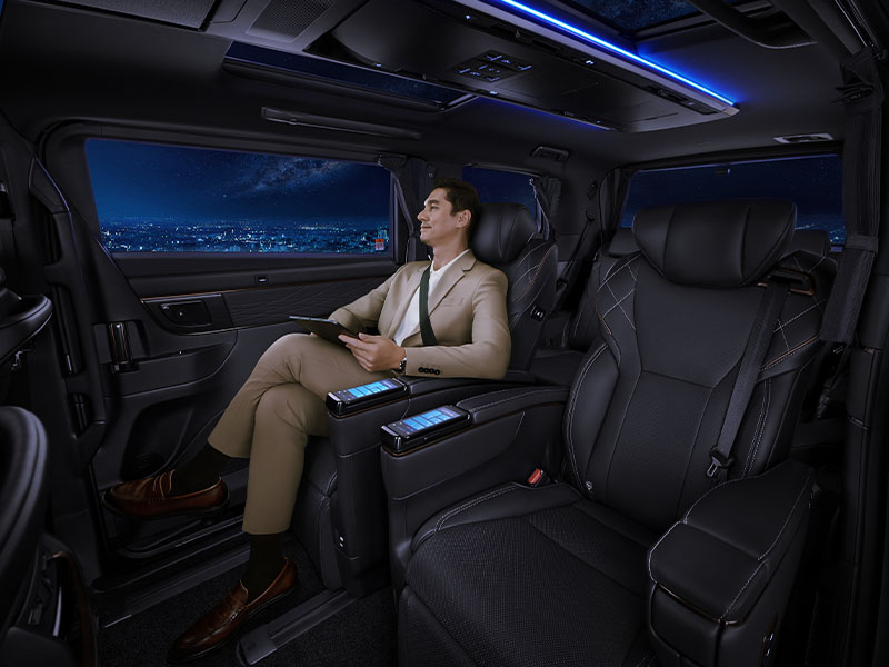 ภายในอลังการกับงานออกแบบหรูออปชันครบทั้งจอสัมผัสขนาดใหญ่ตั้งแต่ 14 นิ้วรองรับการเชื่อมต่อผ่านแอป T-Connect เชื่อมต่อได้ทั้ง Apple CarPlay และ Andorid Auto ถัดลงมาเป็นปุ่มการทำงานของจอสัมผัสและเครื่องปรับอากาศแยกอุณหภูมิ พร้อมมาตรวัดดิจิทัล 12.3 นิ้ว พวงมาลัยมัลติฟังก์ชัน 3 จอแสดงข้อมูลการขับขี่เหนือแผงคอนโซลหน้า Head-Up Display รวมถึงชุดเบาะนั่ง VIP Captain Seat ดีไซน์หรูโอบกระชับกว่าเดิม มีจอการทำงานดีไซน์คล้ายกับสมาร์ตโฟนขนาด 5.5 นิ้ว ไฟสร้างบรรยากาศ Ambient Light LED  64 สีบนหลังคา และ ลำโพงคุณภาพพรีเมียม JBL 15 จุด ช่องชาร์จแบบเสียบสายผ่าน USB-C ทั้ง 2 จุด กับระบบความปลอดภัย Toyota Safety Sense