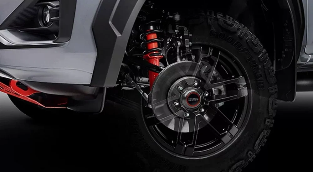 นอกนั้นในด้านของการเสริมขีดความสามารถของสมรรถนะตัวรถ จะเน้นหนักไปที่ช่วงล่าง ด้วยโช้กอัพ Twin Tube ขนาดแกน 35 มิลลิเมตร จาก MTV ซึ่งถูกระบุว่าช่วยเพิ่มได้ทั้งขีดความสามารถในการควบคุมและความทนทานยามบุกตะลุย เช่นเดียวกับชุดระบบกันสะเทือนหลัง ที่มีการปรับเซ็ทใหม่เช่นกัน และยังเพิ่มชุดยกอีก 29 มิลลิเมตร (ราว 1.14 นิ้ว) เข้าไปอีก จนทำให้ระยะความสูงใต้ท้องรถขยับขึ้นเป็น 244 มิลลิเมตร