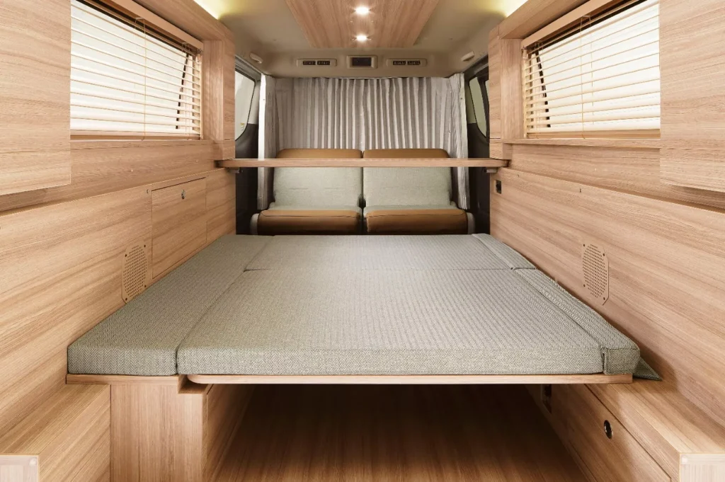 เมื่อเปิดเข้ามาที่ภายในจะพบพื้นที่ด้านหลังขนาดใหญ่กรุด้วยไม้ชนิดพิเศษทั้งพื้นและผนังทั้งแผงมีทั้งโต๊ะ เก้าอี้ ดัดแปลงเป็นเตียงนอน โต๊ะนั่งทานข้าว โต๊ะทำงาน เป็นได้ทั้งห้องนั่งเล่น ห้องนอน ห้องทำงาน พิเศษด้วยเบาะนั่งตอนที่สองสามารถพับไปเป็นเบาะฝั่งตรงข้ามได้แบบ first “2 in 1 seat” พร้อมผ้าม่านกั้นระหว่างคนขับกับด้านหลัง ม่านกระจกด้านข้างซ้าย-ขวา สวิตช์เปิด-ปิดไฟหลังคา มีจอสไลด์ม้วนสำหรับดูหนัง พร้อมเครื่องปั่นไฟแบบพกพาจากแบตเตอรี่เก่าจากรถยนต์ Nissan Leaf นำมาทำการ refurbished ใหม่  สามารถจ่ายพลังงาน 1.67 kWh ซึ่งแปลงเป็น 112 Ah หรือเท่ากับ 112,000 mAh และสมมติว่ามันมีความจุลดลง 20% สองโมดูลในนั้นจะยังมีพลังงานเพียงพอที่จะใช้ชาร์จ iPhone ขนาดใหญ่ที่สุดในปัจจุบันได้มากกว่า 40 ครั้ง ปลั๊กเสียบ AC 100 V