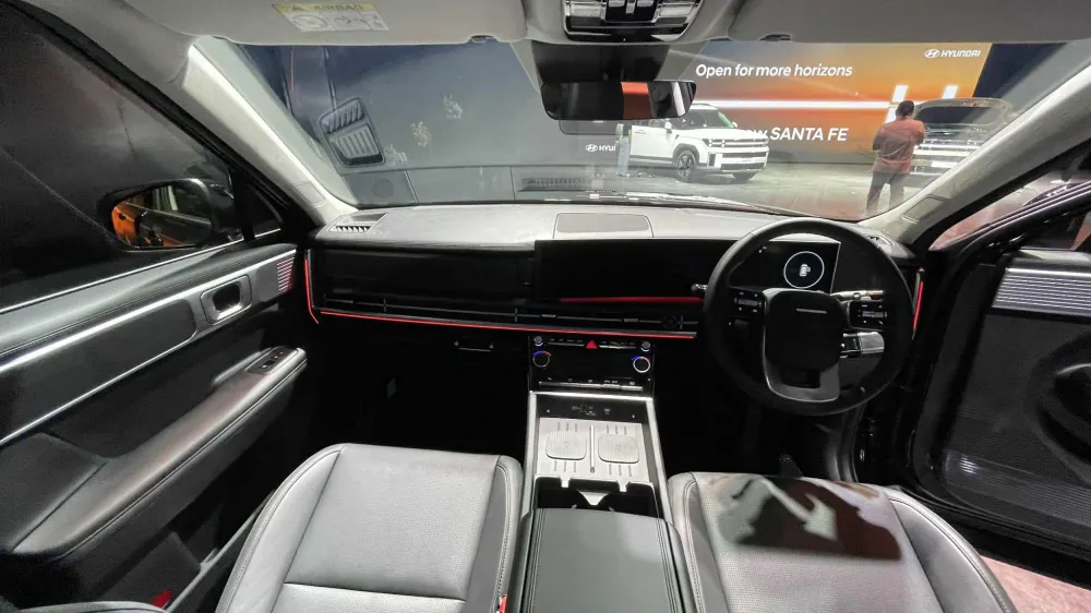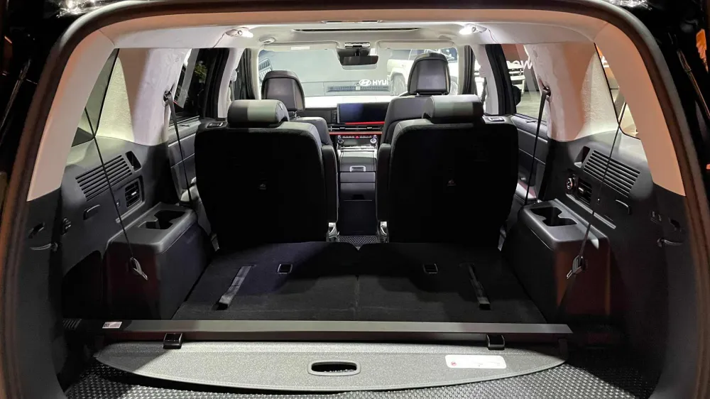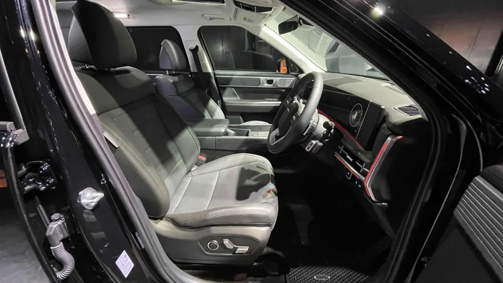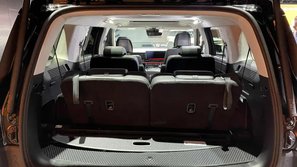 ภายในหรูในสไตล์ 3 แถว 6 ที่นั่ง วัสดุหุ้มหนังแบบ NAPPA คู่หน้าฝั่งคนขับปรับได้ 10 ทิศทาง พร้อมระบบจดจำตำแหน่งท่านั่ง เบาะผู้ขับ 2 ตำแหน่ง พวงมาลัยมัลติฟังก์ชันสามก้านดีไซน์ย้อนยุคนึกถึงรถเก่ายุค 80 ของค่ายอย่าง Hyundai Grandeur พร้อมก้านปรับตำแหน่งเกียร์ที่คอพวงมาลัยฝั่งขวา, จอแสดงผลข้อมูลตัวรถ และจอแสดงผลระบบอินโฟเทนเมนท์เชื่อมกันแบบ Curve Screen โดยมีขนาดฝั่งละ 12.3 นิ้ว รองรับการเชื่อมต่อไร้สายทั้ง Apple Car Play และ Android Auto ปุ่มการทำงานจอสัมผัสใต้ช่องแอร์แนวยาว ที่ชาร์จ USB Type-C และแบบไร้สายสูงสุด 2 ตำแหน่ง