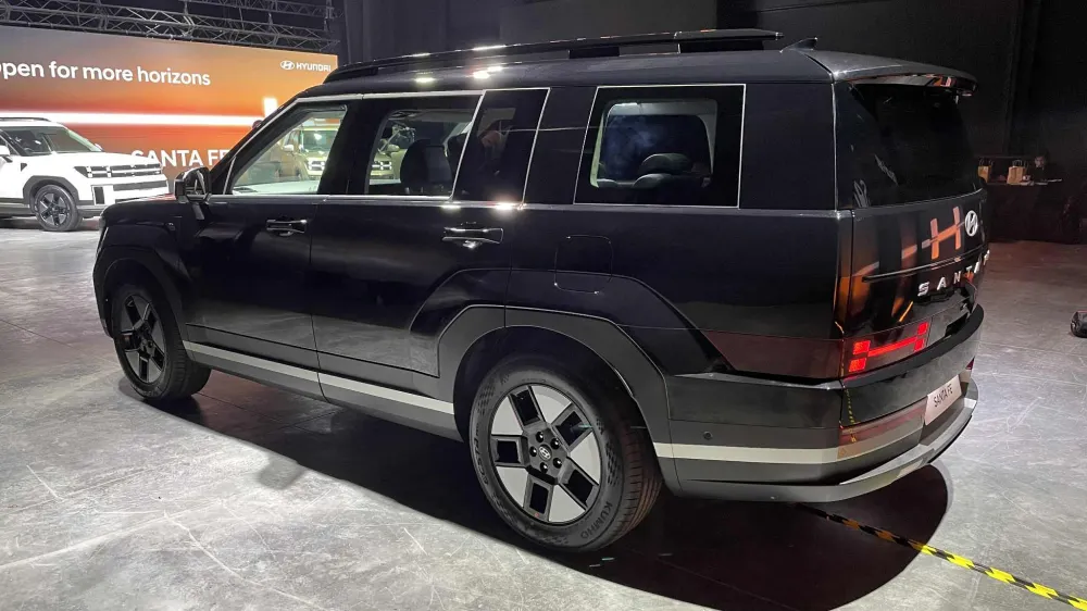 ด้านข้างบึกบึนกับซุ้มล้อและคิ้วขอบล้อสีดำทรงสี่เหลี่ยม ราวหลังคา ไฟท้ายแนวยาว LED รูปตัว H อยู่แนวต่ำใต้ตราโลโก้ Hyundai ชื่อรุ่น Santa FE ในชุดกันชนหลังมีไฟเลี้ยวกับไฟถอยทรงเสน่ห์ พร้อมฝาท้ายเปิดปิดด้วยระบบไฟฟ้าหลังคากระจกแบบคู่ กับล้ออัลลอยด์ขนาด 18 นิ้ว