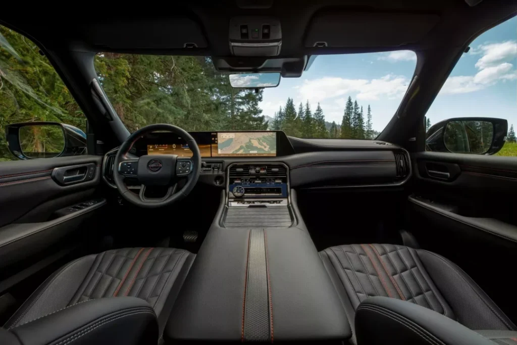 ดังนั้นสิ่งคุณจะสามารถสัมผัสได้ทันทีเมื่อเห็นงานออกแบบภายในห้องโดยสารของ 2025 Nissan Armada / Nissan Patrol ก็คือกลิ่นอายความหรูหราดูดี ที่พกมากันอย่างเต็มระบบ โดยเฉพาะชุดหน้าจอแสดงผลระบบอินโฟเทนเมนท์ขนาด 12.3 นิ้ว ที่เชื่อมต่อเป็นแผงเดียวกันกับหน้าจอแสดงผลข้อมูลตัวรถขนาดเท่ากัน และติดตั้งแบบกึ่งลอยตัวจากคอนโซลออกมาตามสมัยนิยม, งานออกแบบรายละเอียดคอนโซลที่เน้นความเรียบง่าย แต่ต้องใช้งานได้จริง โดยเฉพาะปุ่มควบคุมระบบปรับอากาศที่ยังคงมีให้ตรงคอนโซลกลาง และส่วนฐานล่างของคอนโซลหน้าตรงกลางก็มีช่องเก็บของขนาดใหญ่พร้อมแท่นไวร์เลสชาร์จอยู่ด้านใน
