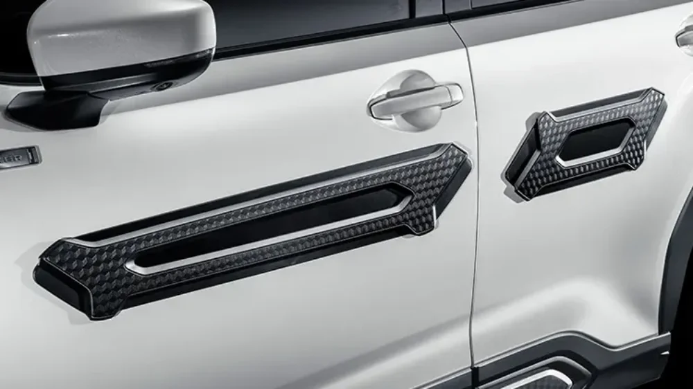 พร้อมกันนี้ยังมีการติดตั้งแผ่นพลาสติกกันกระแทก เอาไว้ที่ประตูทั้ง 4 บาน รวมถึงบริเวณข้างไฟหน้ากับไฟท้าย เพื่อลดโอกาสตัวถังได้รับความเสียหาย หรือโคมไฟแตกขณะบุกป่าฝ่าดง, เพิ่มตัดปิดขอบแร็คหลังคาและจบงานด้วยการแปะสติ๊กเกอร์สีดำไว้บนฝากระโปรง, แปะสติ๊กเกอร์รูปภูเขา เอกลักษณะประจำตัวไว้ที่ชายล่างบานประตูทั้งด้านข้างและด้านหลัง กับทำสีกรอบกันกระแทกที่กันชนหน้ากับกันชนท้ายให้กลายเป็นสีฟ้าเพื่อตัดโทน