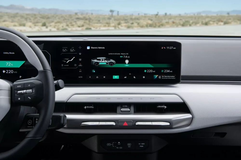ภายในตัวรถ เน้นงานออกแบบเรียบง่าย สะอาดตา ให้ปุ่มควบคุมระบบต่างมาเพียงพอใช้ แต่ยังคงโดดเด่นด้วยหน้าจอแสดงผลขนาดใหญ่ถึง 30 นิ้ว โดยแบ่งเป็นจอแสดงผลหน้าผู้ขับ 12.3 นิ้ว คั่นกลางด้วยจอแสดงผลและปรับตั้งระบบปรับอากาศขนาด 5 นิ้ว และถัดมาคือจอแสดงผลระบบอินโฟเทนเมนท์ขนาด 12.3 นิ้ว ซึ่งรองรับระบบนำทำด้วย GPS ในตัว และมีระบบอัพเดทซอฟท์แวร์ผ่านสัญญาณดาวเทียม OTA, รองรับการเชื่อมต่อกับโทรศัพท์มือถือผ่านระบบ Apple CarPlay และ Android Auto ไร้สาย, และมีระบบสั่งการด้วยเสียงในตัว