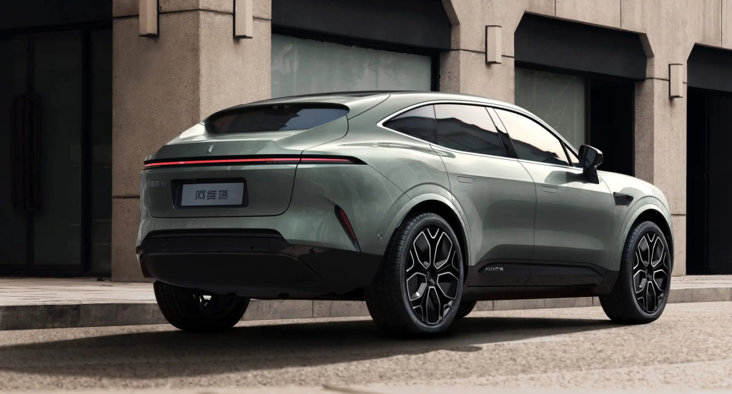 และด้านท้ายรถก็มีการปรับทรงให้ตัวรถมีความท้ายลาด คล้ายๆกับ Porsche Cayenne Coupe, BMW X6 แต่เจ้า Avatr 11 จะเน้นการใช้เส้นสายที่ดูเรียบง่ายกว่า โดยเน้นไปที่การเชื่อมต่อเส้นโค้งมาจากข้างตัวถัง แล้วตวัดเข้ากับแถบไฟท้ายแอบบ Cross Tail Light ที่ค่อนข้างแบน