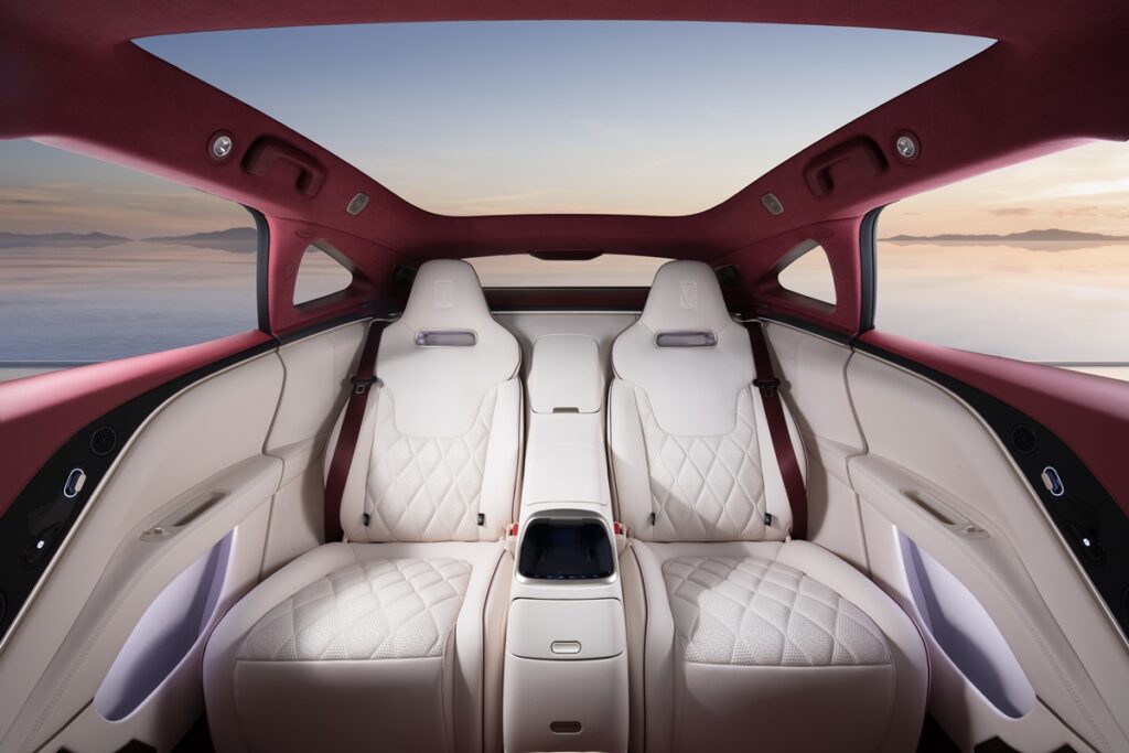 ภายในถ่ายทอดความหรูหราระดับเฟิร์สคลาส ด้วยเพดานกำมะหยี่ Merlot Red Suede ตัดกับเบาะหนัง Rose White Semi-Aniline ที่ให้สัมผัสหรูหรากว่าหนัง Nappa แบบดั้งเดิม พื้นที่โดยสารด้านหลังถูกยกระดับเป็น Executive Seating Suite พร้อมเบาะ VIP 4 ที่นั่ง และที่วางแขนกลางแบบลอยตัว (Floating Armrest) รองรับฟังก์ชันนวด 8 จุด ระบบชาร์จไร้สายกำลังสูง 50W พร้อมแผงควบคุมแบบสัมผัส Zero-Gravity Seats มาพร้อมระบบนวด อุ่น และระบายอากาศ