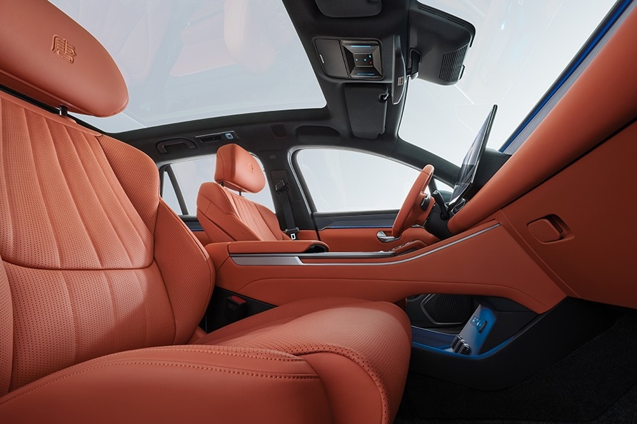 กระจกประตู 4 บานแบบ 2 ชั้นอย่างหนาเพื่อเพิ่มความรู้สึกเงียบสงบ และยังมีตู้เย็นขนาดเล็ก พร้อมเครื่องปรับอากาศแยกอิสระอุณหภูมิซ้าย-ขวา และด้านหลังถึง 3 โซน พวงมาลัยมัลติฟังก์ชัน 3 ก้านทรงท้ายตัด จอ Driver Display แสดงผลในรูปแบบดิจิตอล LCD ให้เลือกทั้งแบบ 10.25 นิ้ว ถัดไปอีกเล็กน้อยคือ AR-HUD Head-up Display 26 นิ้วแสดงข้อมูลที่จำเป็นโดยที่ผู้ขับไม่ต้องละสายตาจากถนนเบื้องหน้าส่วนจอแสดงผล ระบบ Infotainment ขนาดใหญ่เต็มตาถึง 15.6 นิ้ว ปรับหมุนได้ด้วยระบบไฟฟ้า เชื่อมต่อ Apple Car Play, Android Auto รองรับ 5G