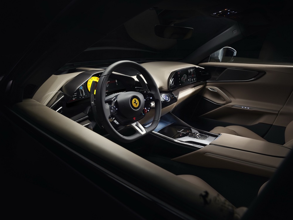 เจ้า Purosangue กลับไม่มีหน้าจอกลางปรากฏอยู่บนคอนโซลแต่อย่างใด ทว่ามันจะมาพร้อมกับชุดหน้าจอกลางกรอบกลม สำหรับแสดงบอกเวลา หรือแรงเหวี่ยงขณะขับขี่ และข้อมูลอื่นๆเพียงเล็กๆน้อยๆเท่านั้น และจะมีจอแสดงผลระบบอินโฟเทนเมนท์ที่ติดตั้งบนคอนโซล ตำแหน่งหน้าตรงของผู้โดยสารแทน ส่วนจอมาตรวัดเองก็ยังคงเป็นแบบฟูลดิจิตอล TFT ตามสมัยนิยมเช่นเคย รวมถึงงานตกแต่งชิ้นส่วนต่างๆภายในห้องโดยสาร ก็ยังคงเน้นไปที่งานหนัง ซึ่งถักปักเย็บมาอย่างดี และมีเส้นสายที่ดูสปอร์ตเป็นหลักตามสไตล์เฟอร์รารี่