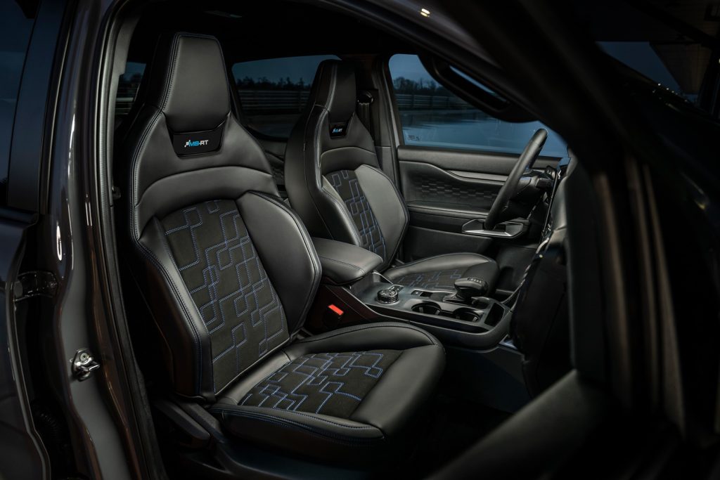 ภายในตัดเย็บอย่างหรูด้วยเบาะนั่งกึ่งหนังแท้สีดำเดินด้ายสีน้ำเงินทรงสปอร์ต พวงมาลัยมัลติฟังก์ชันสามก้านลวดลายพิเศษหุ้มหนังเดินด้ายน้ำเงินพร้อม On-Centre Marker แถบสีน้ำเงินด้านบนของพวงมาลัย พร้อมออปชันเดิมไม่ว่าจะเป็น หน้าจอแสดงผลจอสีแบบสัมผัส Multi-Touch ขนาด 12 นิ้ว พร้อมระบบสั่งงานด้วยเสียง SYNC® 4A รองรับ Wireless Apple CarPlay® Android Auto™ สามารถเชื่อมต่อบลูทูธ ช่องต่อ USB 4 จุด มาตรวัดดิจิทัลแบบสีขนาด 12.4 นิ้ว และ ระบบปรับอากาศแบบอัตโนมัติแยกอิสระซ้าย-ขวาและปรับอากาศสำหรับผู้โดยสารตอนหลัง กระจกมองหลังแบบปรับลดแสงอัตโนมัติ พร้อมช่องต่อ USB