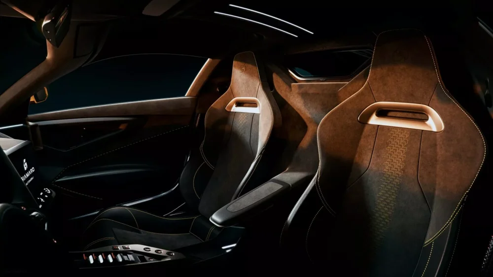 ท้ายสุด สำหรับภายในห้องโดยสาร ทางค่ายไม่ได้มีการเปิดเผยถึงลูกเล่นมากนัก นอกจากการระบุว่า มันจะได้รับการออกแบบโดยได้แรงบันดาลใจในการตกแต่งมาจากเครื่องบินรบ และเน้นทำให้ปุ่มสั่งการ กับหน้าจอแสดงผลต่างๆหันเข้าสู่ตัวผู้ขับเป็นหลัก โดยที่วัสดุการตกแต่งต่างๆจะผสมกันไประหว่าง หนังกลับอัลคันทาร่า, คาร์บอนไฟเบอร์ และชิ้นงานอลูมิเนียม CNC ที่จะถูกออกแบบสัดส่วนความสวยงามไว้อย่างลงตัว