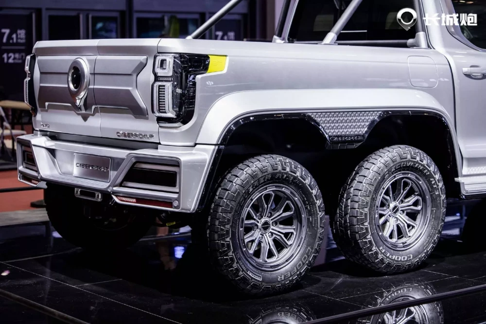 และจุดที่ถือเป็นไฮไลท์ ก็คือชุดกระบะพร้อมฝาท้ายแบบประตูตู้กับข้าว ที่ถูกยืดยาวออกไปพอประมาณ เพื่อรองรับการเปิดพื้นที่ซุ้มล้อให้กว้างขึ้น สำหรับการติดตั้งชุดระบบกันสะเทือน เพลาขับ และล้อหลัง ที่ถูกต่อเพิ่มมาจากตำแหน่งล้อหลังเดิมอีก 1 ชุด และแน่นอนว่านั่นทำให้มันกลายเป็นรถขับเคลื่อน 6 ล้อ หรือ 6×6 ในทันที