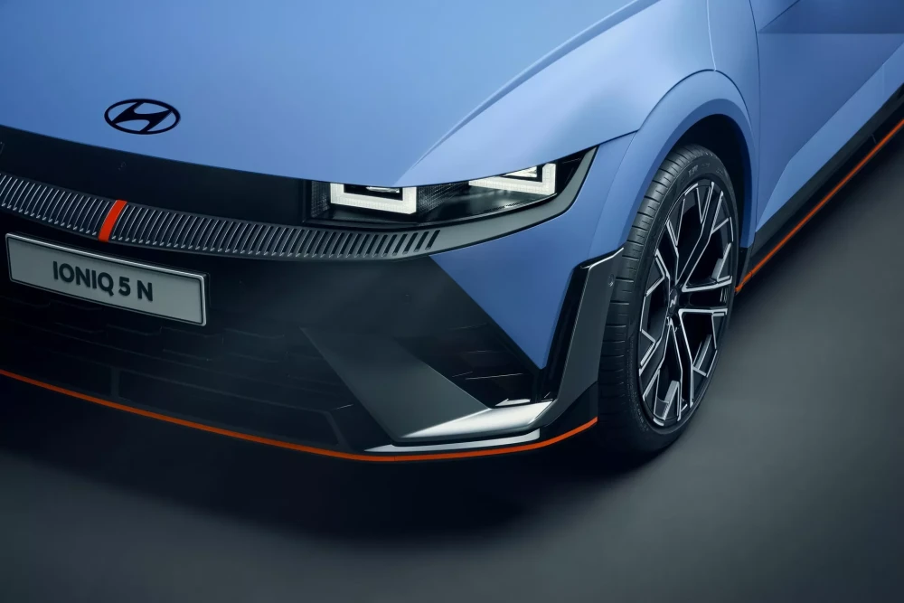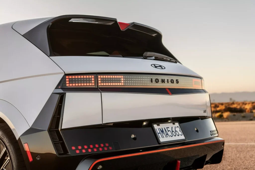 Hyundai Ioniq 5 N มาพร้อมกับหน้าตา ที่ไม่ได้หนีไปจากร่างต้นเท่าไหร่นัก เพราะมันยังคงใช้โครงสร้างพื้นฐานเดียวกัน แต่ก็ยังได้รับการตกแต่งเพิ่ม “ความซิ่ง” ให้กับตัวรถเข้าไปในหลายๆจุด ตั้งแต่กันชนหน้าแบบใหม่ที่ดูสปอร์ตมากขึ้น เพิ่มโป่งซุ้มล้อให้ยื่นออกมาด้านข้างตัวถังมากกว่าเดิม ปรับรายละเอียดสปอยเลอร์หลังเล็กน้อย