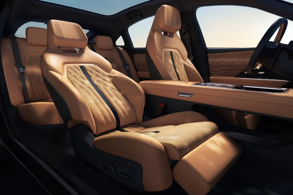 และในฝั่งเบาะนั่งโดยสารทั้งหมด ก็มีการหุ้มด้วยหนัง Nappa เจาะรูอย่างดี โดยที่หัวหมอนของชุดเบาะโดยสารคู่หน้า ก็ดูเหมือนว่าจะมีการฝังลำโพงเอาไว้ด้วย เพื่อสุนทรียภาพในการฟังเพลง และยังมีการให้เบาะรองน่องทางด้านล่าง กับหลังคากระจกทั้งแนวหลังคาอีก