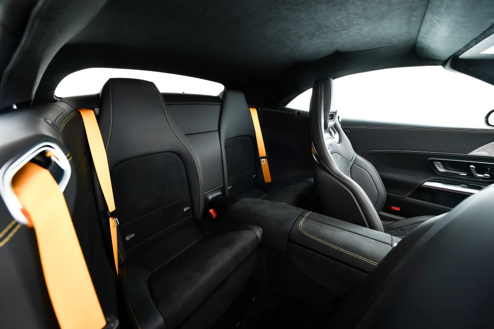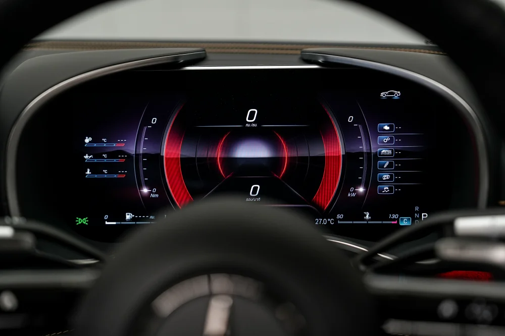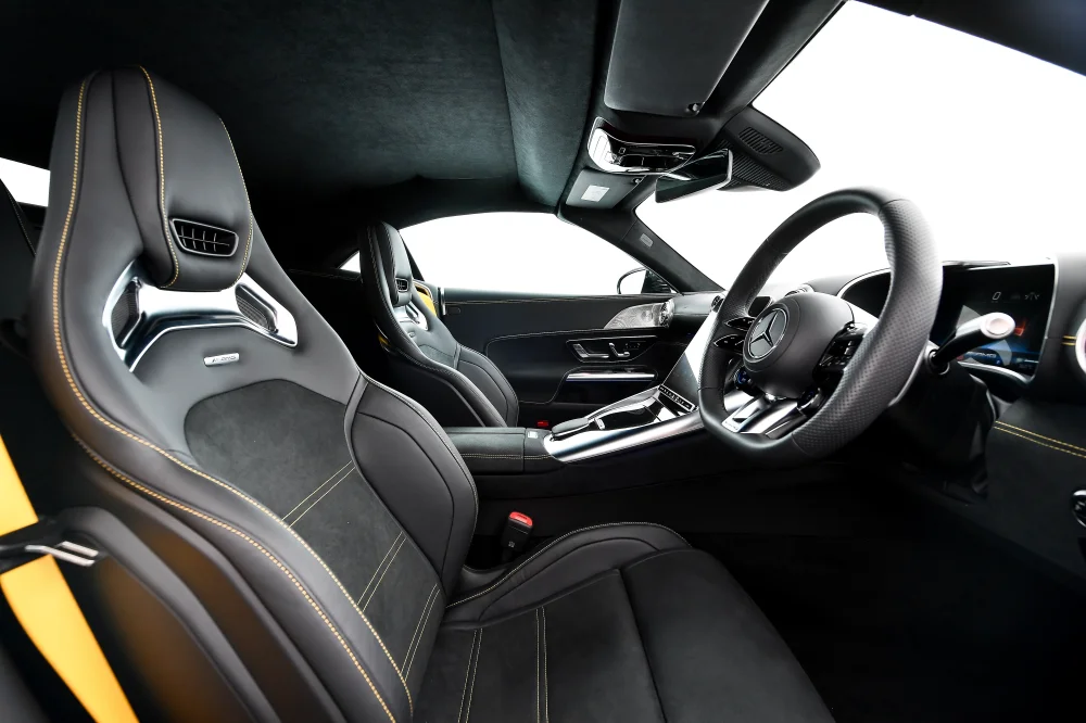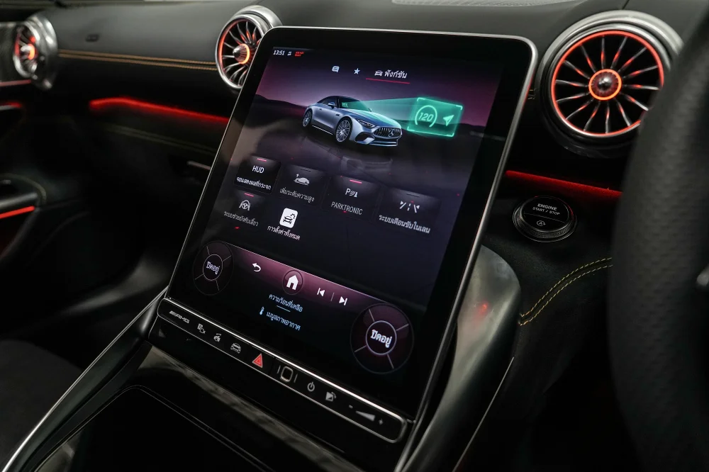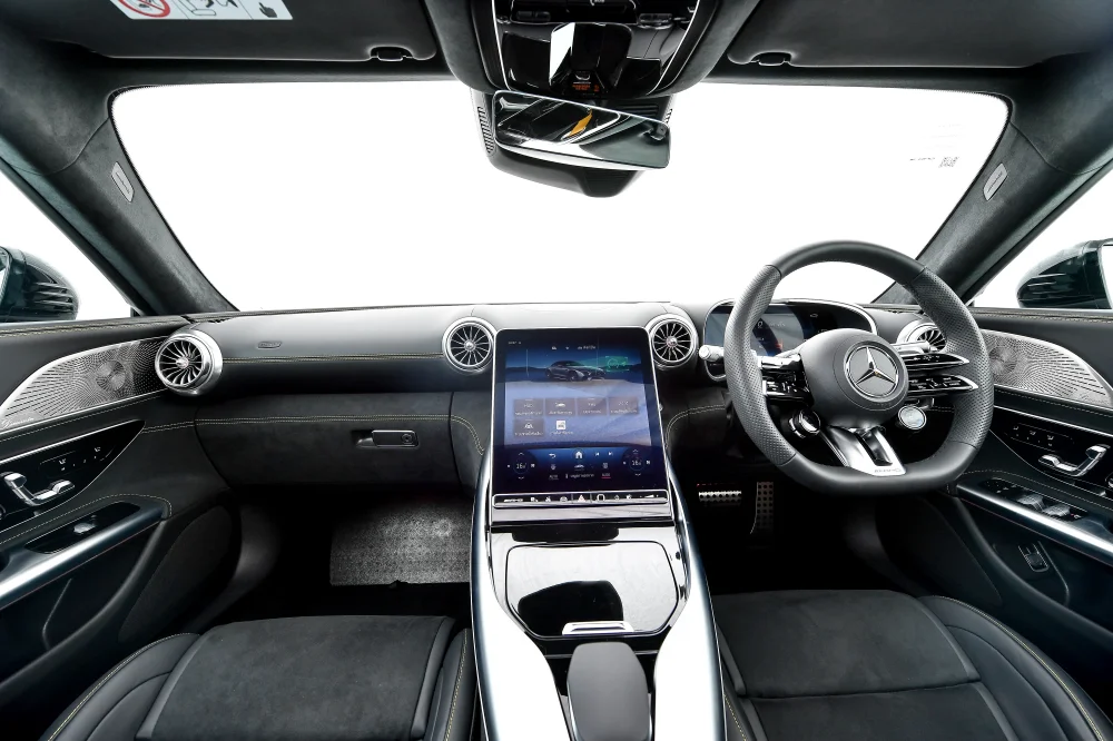 ภายในห้องโดยสารมาพร้อมระบบปฏิบัติการ MBUX7 ทำงานร่วมกับหน้าจอขนาด 11.9 นิ้ว สามารถปรับระดับด้วยระบบไฟฟ้า 12-32 องศา ช่วยปรับให้มองเห็นหน้าจอได้ชัดเจนยิ่งขึ้น พร้อมป้องกันแสงสะท้อนจากการเปิดหลังคาที่มากระทบหน้าจอ ส่วนจอหน้าที่นั่งคนขับเป็นหน้าจอขนาด 12.3 นิ้ว แบบ AMG-specific indicator และยังติดตั้งพวงมาลัยแบบ AMG Performance steering wheel หุ้มหนัง Nappa leather และให้ AMG Sport seats พร้อม AIRSCARF