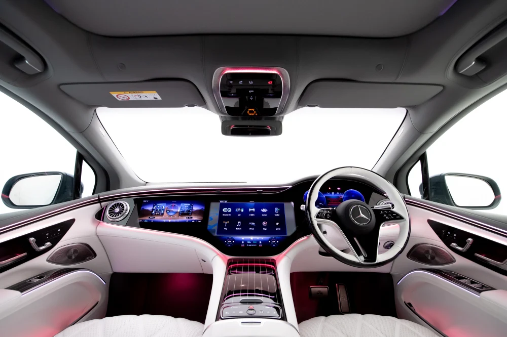 ภายในห้องโดยสาร ตื่นตาตื่นใจด้วยจอ MBUX Hyperscreen ยาวต่อเนื่องกันถึง 56 นิ้วซึ่งออกแบบตามแนวคิด Zero Layer concept พร้อมกระจกป้องกันรอยขีดข่วนคุณภาพสูง Gorilla® Glass แผ่นเดียวต่อเนื่องตลอดทั้งหน้าจอ โดยแบ่งการใช้งานเป็น 3 ส่วน ได้แก่ หน้าจอ Driver Display แบบ LED matrix backlighting ขนาด 12.3 นิ้ว หน้าจอ Central Display แบบ OLED ขนาด 17.7 นิ้ว และ หน้าจอ Co-driver Display แบบ OLED ขนาด 12.3 นิ้ว ซึ่งแสดงผลได้คมชัดยิ่งขึ้นผู้โดยสารสามารถใช้หน้าจอ Co-driver Display ในการช่วยเหลือผู้ขับขี่ โดยสามารถตั้งค่า ตรวจสอบสถานะต่าง ๆ ของรถ ค้นหาแผนที่ และใช้งานสื่อบันเทิงได้โดยไม่รบกวนผู้ขับขี่ ผสานการทำงานกับระบบปฏิบัติการ MBUX เจเนอเรชันที่ 2 ภายใต้ระบบ NTG7 ที่รองรับคำสั่งเสียงได้มากถึง 27 ภาษา