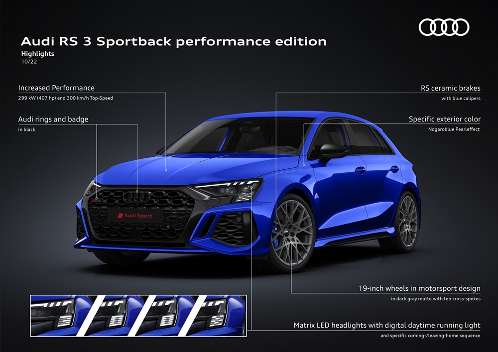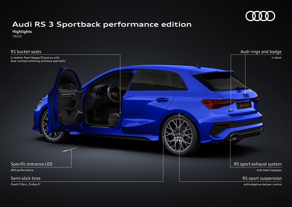 Audi RS3 Performance Edition แท้จริงแล้ว ก็คือตัวรถ RS3 ที่ถูกนำมาปรับแต่งใหม่เล็กน้อย เพื่อให้มันมีสมรรถนะที่ดียิ่งขึ้น และพิเศษยิ่งขึ้น เพราะมันจะถูกผลิตขึ้นมาเพียง 300 คัน บนโลกเท่านั้น