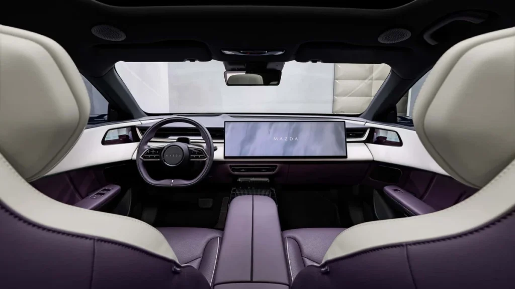 การตบแต่งถายในเป้นทูโทนขาวตัดกับสีเดียวกับภายนอกซึ่งมาสด้าโชว์ตัวตนในแบบสีขาว-ม่วง สะท้อนภาพความหราในแบบมาสด้า ใต้การร่วมงานกับทางแบรนด์รถยนต์ค่ายจีน