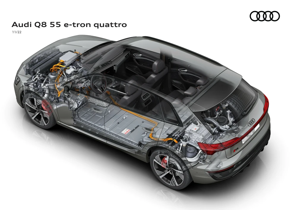 Audi Q8 e-tron มาพร้อมกับระยะทางวิ่งไฟฟ้าที่ไกลสูงสุดถึง 636 กิโลเมตรต่อการชาร์จไฟเต็มหนึ่งครั้ง พร้อมใช้เวลาชาร์จได้เร็วกว่าเดิมเพียงครึ่งชั่วโมง พละกำลังสูงสุด ให้ประสบการณ์การขับขี่แบบ Sport ด้วยแรงม้า 408 hp กับแรงบิดที่สูงถึง 664 Nm เร่งแซงทันใจ 0-100 กิโลเมตร/ชั่วโมง ภายใน 5.6 วินาที