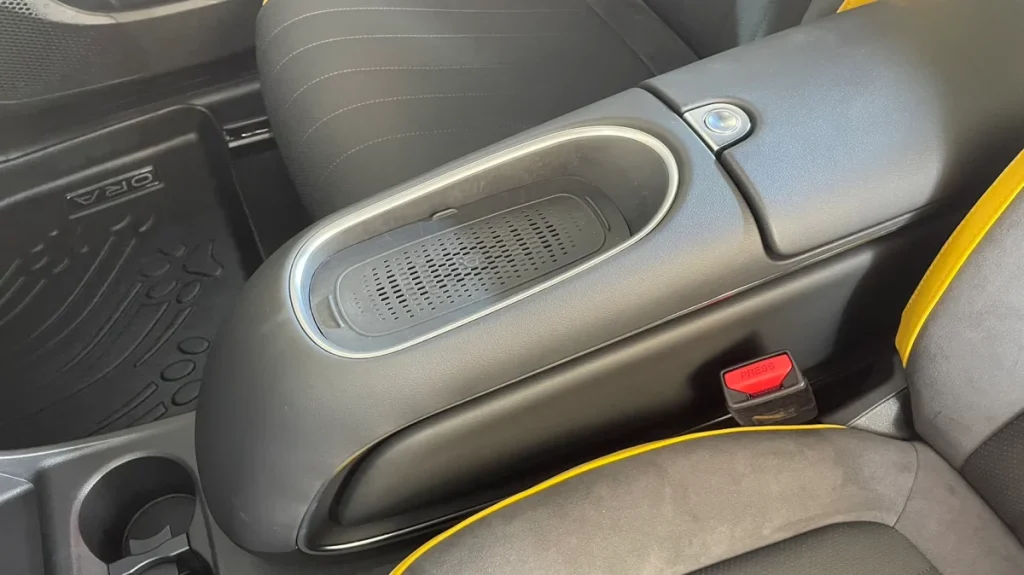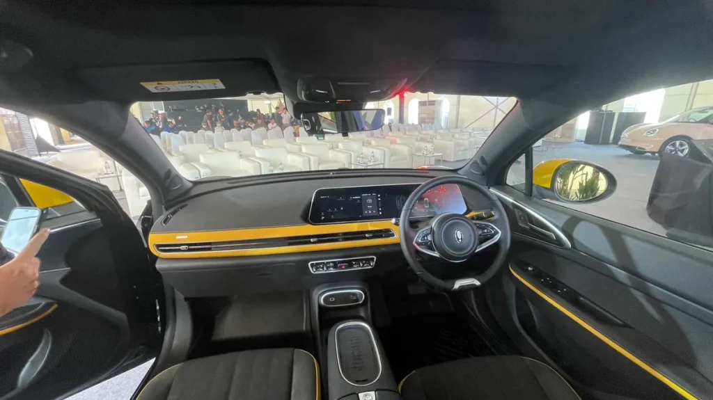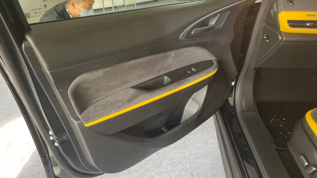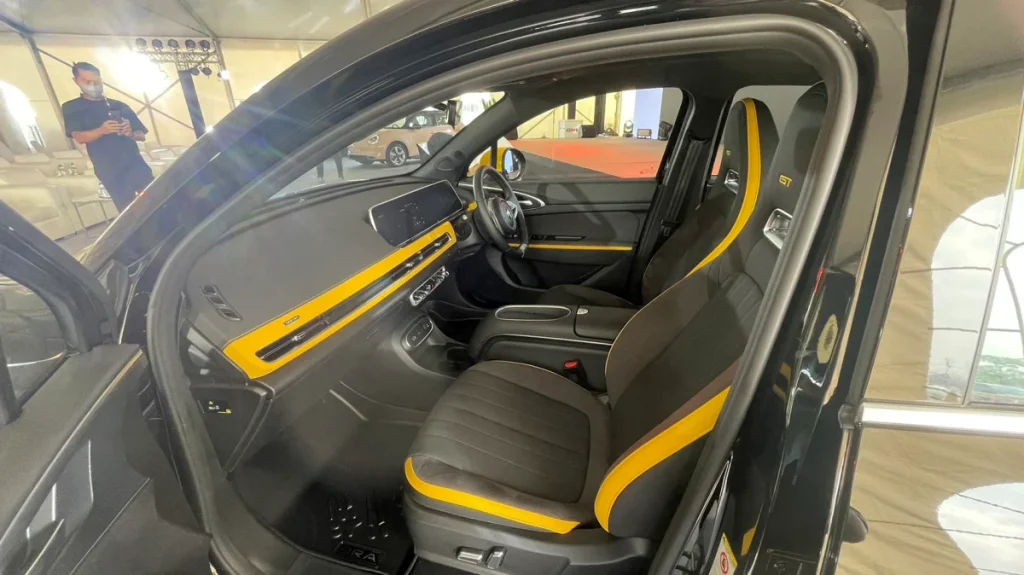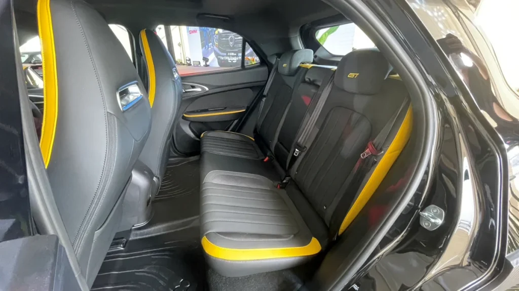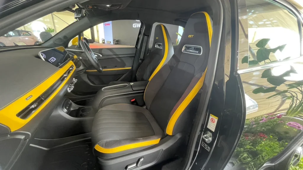 New GWM ORA Good Cat รุ่น GT ถูกออกแบบภายในแบบทูโทนด้วยสีดาและสีเหลืองเป็นเอกลักษณ์ ได้แก่ พวงมาลัยสีดา-เหลือง วัสดุตกแต่งแผงคอนโซลหน้า เบาะนั่งหุ้มด้วยหนังกลับสีดาเย็บด้ายเหลือง และที่เท้าแขนข้างประตูพร้อมตกแต่งสีเหลือง เพื่อมอบความรู้สึกสปอร์ตในห้องโดยสารอย่างไม่เหมือนใคร