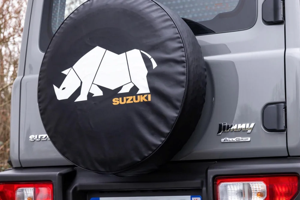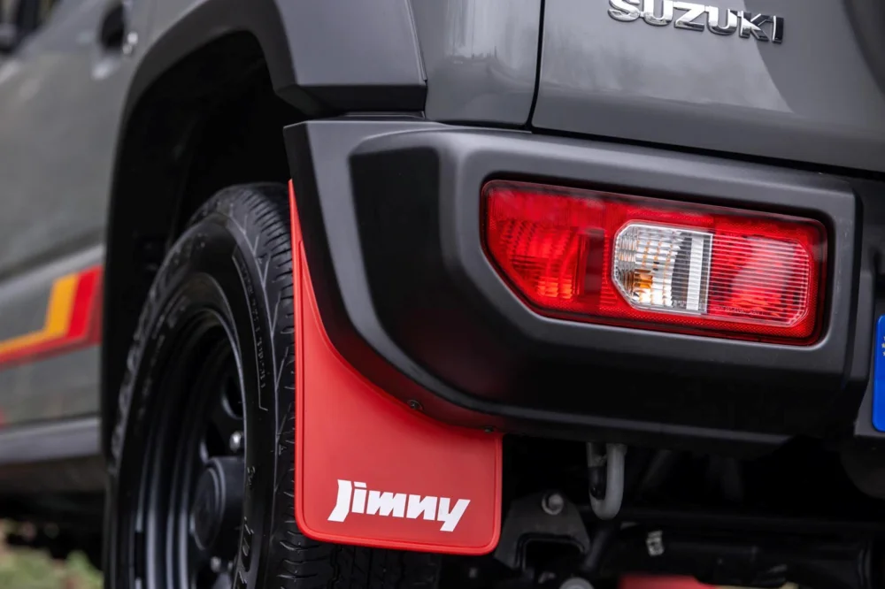 นอกนั้นกันชนหน้าไม่ได้มีการใส่แผ่นกันกระแทกด้านล่างเข้ามา แต่มีแผ่นบังโคลนสีแดง กับการคาดลายสติ๊กเกอร์ช่วงครึ่งล่างแบบ 3 Tone เหลือง-ส้ม-น้ำตาล และได้ชุดซองหุ้มยางอะไหล่สกรีนลายแรด เอกลักษณ์เดียวกับ Jimny โฉมแรกยุคปี 1980’s ในส่วนของงานตกแต่งภายนอก
