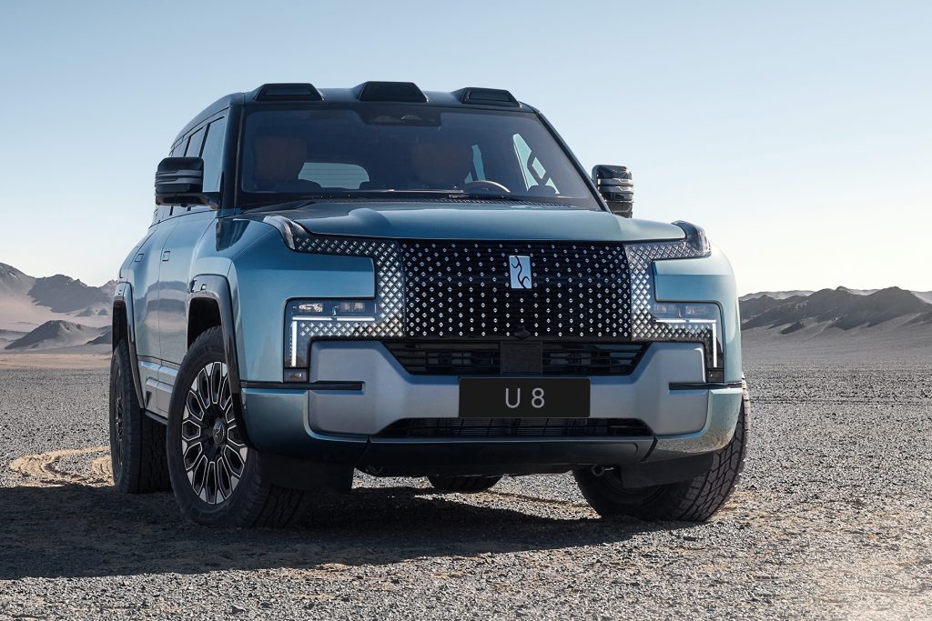 นอกจากจะมีซูเปอร์คาร์ไฟฟ้า YANGWANG U9 ยังมี YANGWANG U8 เอสยูวี ดีไซน์คล้ายคู่แข่งยุโรปทั้ง Land Rover Defender กับ Mercedes-Benz G-Class ตั้งแต่ กระจังหน้าดีไซน์หรูแบบตะแกรงพร้อมไฟเลี้ยววิ่งอยู่บนขอบบังโคลนหน้าซ้าย-ขวา ถัดลงมาเป็นชุดไฟหน้า LED แบบ Dual ทรงเลขเจ็ด หลังคารถมีดีไซน์นูนๆส่วนหน้าออกมาสามจุด ด้านท้ายคล้ายกับ Land Rover Defender หรือ Mercedes-Benz G-Class