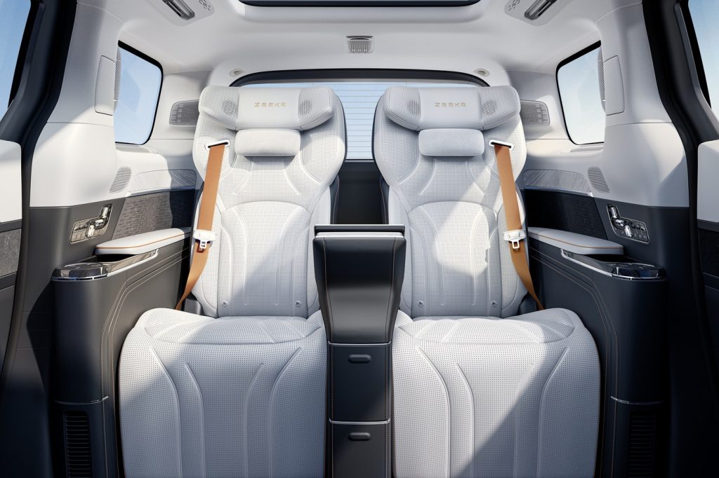 ด้านข้างอลังการดับดีไซน์ทั้งรูปแบบเสา A จนถึงเสา D กระจกเล็กบริเวณเสา A ดีไซน์กระจกเสา B ที่เล่นระดับต่อเนื่องจนถึงเสา C กระจกมองข้างทรงสปูนทรงใหญ่ ประตูสไลด์ไฟฟ้าเปิดได้สองข้าง หลังคาพาโนรามิกซันรูฟแบบคู่สองบานทั้งบานเล็กฝั่งคนขับตอนหน้าและบานใหญ่ฝั่งผู้โดยสาร เสาอากาศแบบครีบฉลาม ด้านท้ายเห็นไฟท้าย LED แนวยาวสองฝั่งติดตราตัวอักษร ZEEKR แบบเว้นช่องเรืองแสงในชุดฝาท้ายขนาดใหญ่พร้อมสปอยเลอร์หลัง ล้ออัลลอยลายสปอร์ตปัดเงาขนาดใหญ่ 20 นิ้ว
